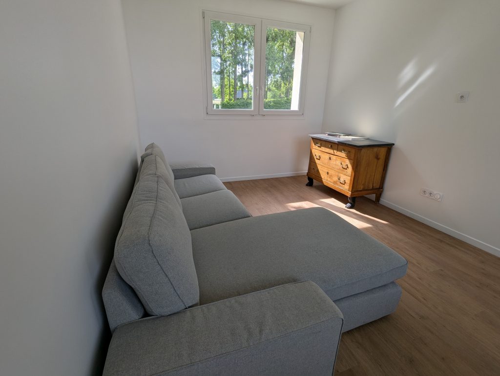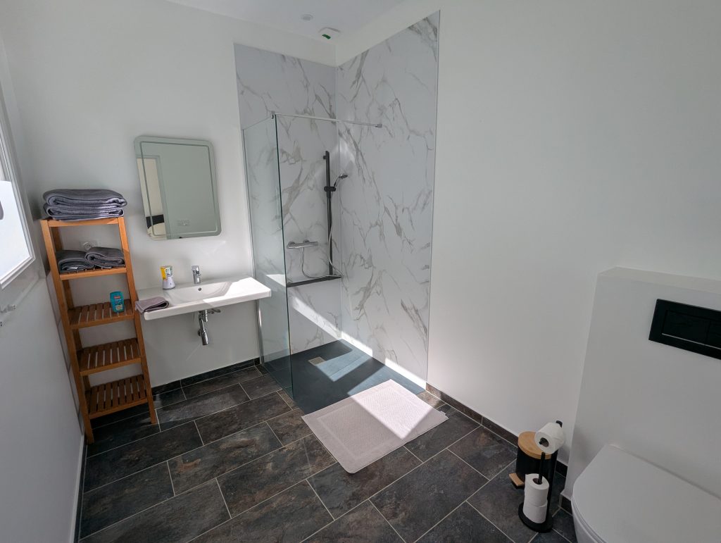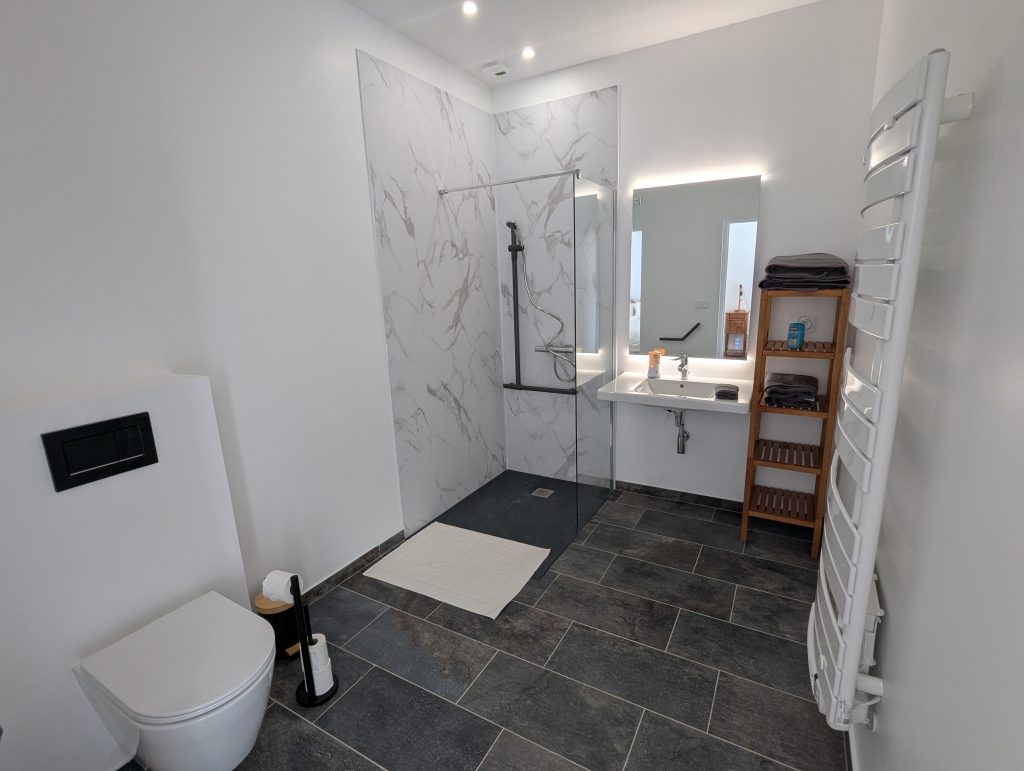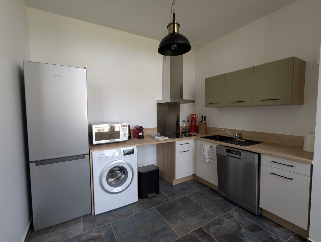 Each bedroom has an en-suite shower room with toilet. Two bedrooms are equipped with queen-size beds (160×200 cm), and one bedroom has two 90×200 cm beds that can be joined together to make a king-size bed. At the end of the hallway leading to the three bedrooms, you will find a kitchen area and a living/dining room. In the kitchen, you will find a dishwasher, a washing machine, a refrigerator, and an induction hob. For your comfort, beds are made upon arrival, and towels are provided.